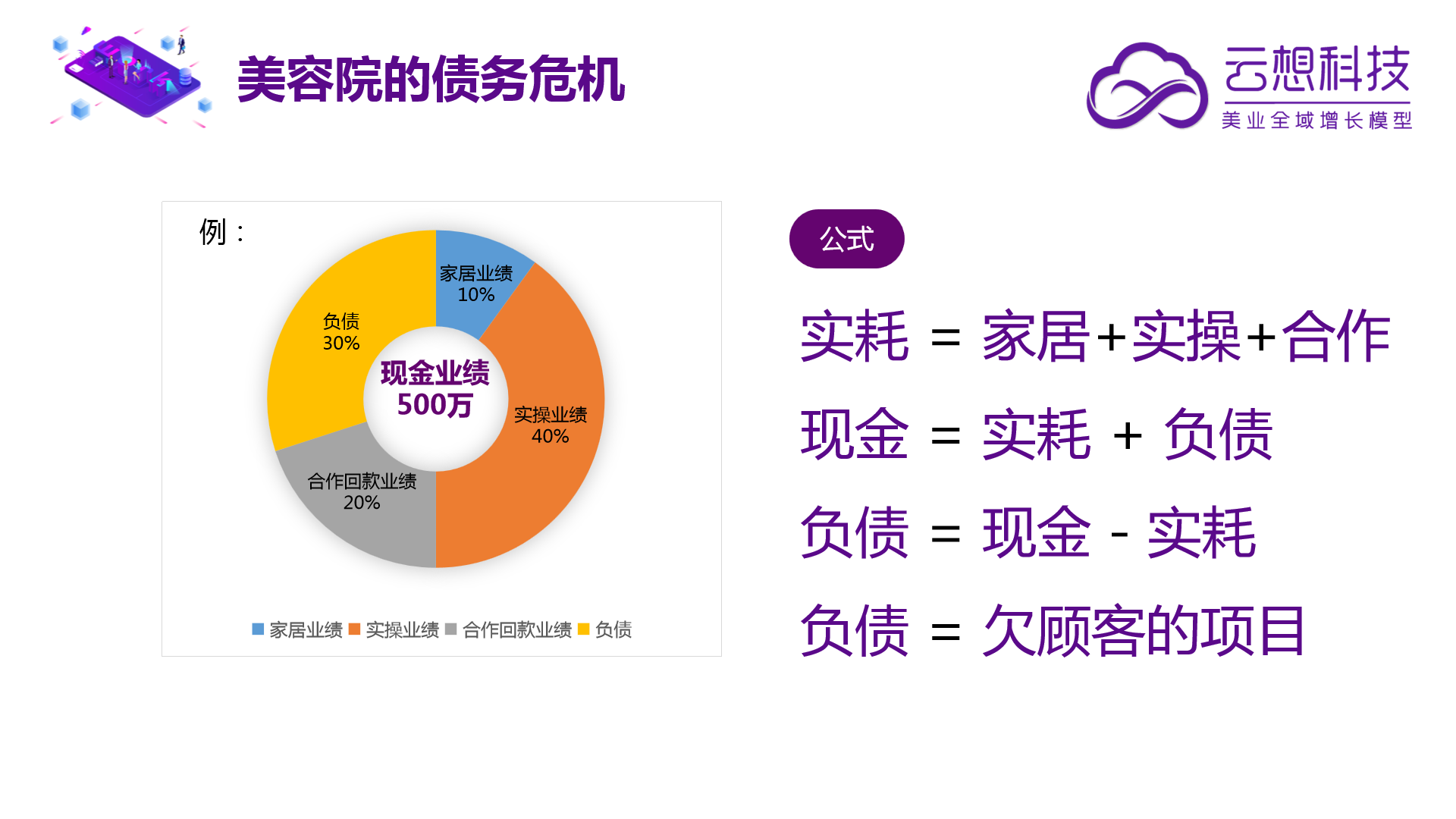 比如,美容院今年实际收到现金业绩总额为500万元,那么其中家居业绩(顾客实际购买并带回家的家居产品)50万元,操作业绩200万元,合作项目回款业绩(合作项目回款业绩,跟家居销售一样,销售消耗同步完成)100万元,另外剩余150万元,是顾客尚未做完的项目。那么这家美容院欠顾客的项目,150万元是负债。